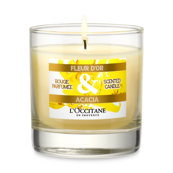 "Illuminez votre intérieur avec la bougie parfumée Fleur d'Or & Acacia, d'une senteur florale lumineuse née de l'union du mimosa et de l'acacia.